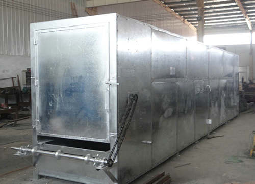 物料由加料器(或手工操作)均匀地铺在网带上,网带一般采用12~16目的不锈钢丝网(也可根据物料不同选择不同的网带、钢带),由转动装置拖动在干燥机内移动。干燥机由若干单元组成,每一单元热风可独立循环,部分尾气由专门的排湿风机排出,废气排出量由调节阀控制。热气由下向上穿过铺满物料的网带,完成热量与质量的传递,带走物料水分,从而实现干燥过程。网带允许的速度可根据物料水份及温度要求调节,单元数量也可根据需要选取。
