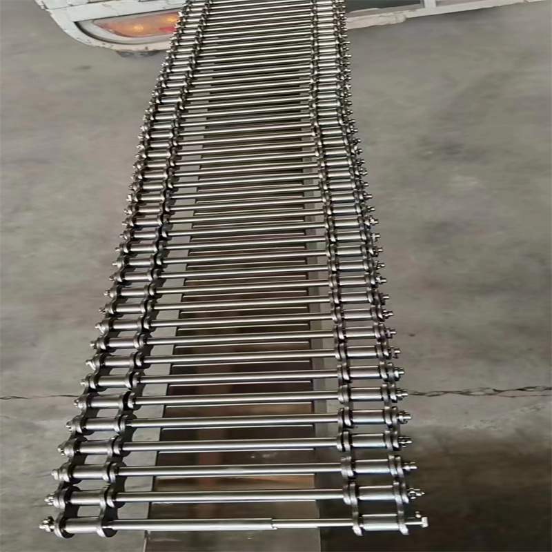 链杆输送带也叫棒条网带,串杆网带。可用链条传送,也可用U型链条传送。故此可以称链条网带和U型链条网带。 这种链杆式网带采用链条传动,适合用于大型和重型传送,其运动平稳、气力大,网面相对受力小,能对输送网带起到保护用,价格较贵,但使用寿命长。